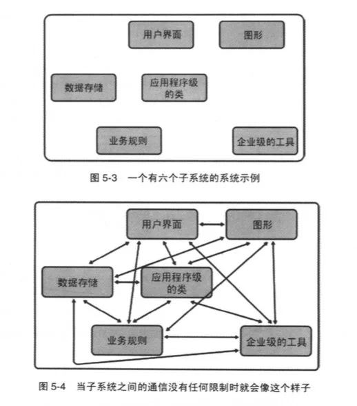 有先见之明的话,所有这些问题就不会花太多额外的功夫。只有当“确需了解”——最好还有合理的理由——时,才应该允许子系统间的通信。如果你还拿不准该如何设计的话,那么就应该先对子系统之间的通信加以限制,等日后需要时再放开,这要比先不限制,等子系统间已经有了上百个调用时再加以限制要容易得多。图 5-5 展示了施加少量通信规则后可以把图 5-4 中的系统变成的样子: