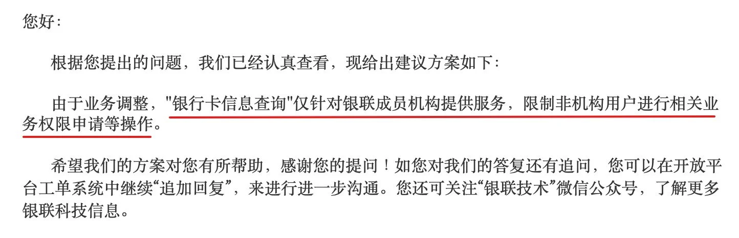 不知道你在用手机银行转账时注意过没有,当你输入卡号时,会自动识别归属银行,识别失败时,则会让用户手动选择。最近在做一个类似银行卡信息需求时,想到应该会有这样的一个接口,Google 后发现还真的有官方接口,而且有体验页面👉银行卡信息查询体验,详细的接口信息银行卡信息查询。不过当我注册了开发者时,发现该接口无法使用,提交工单后得到以下回复