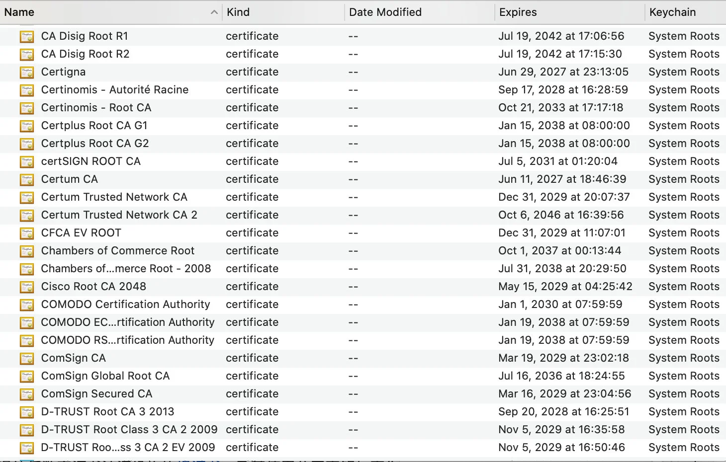 我们可以在 Mac 中的 Keychain Access 中查到这些内置根证书。