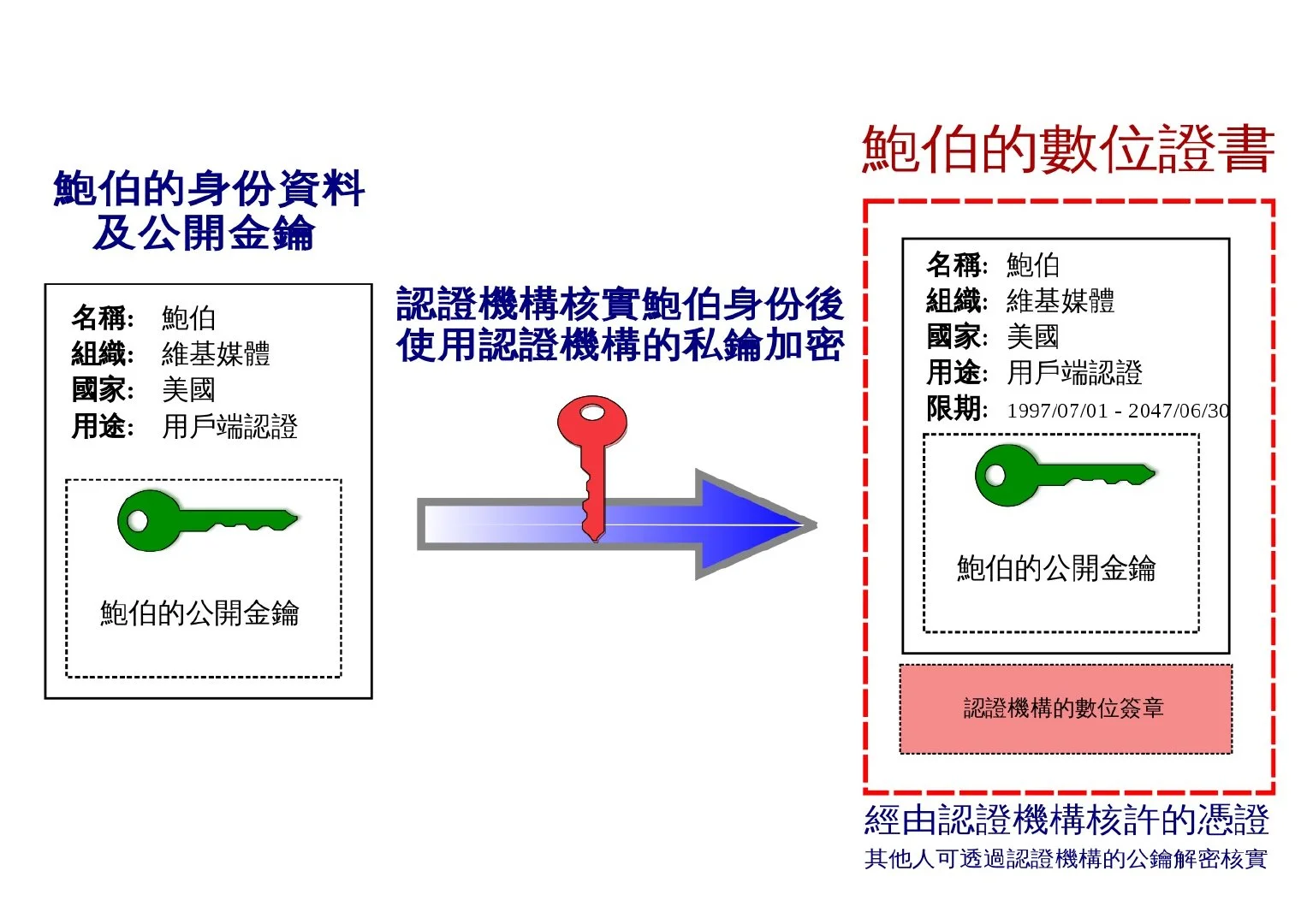 - 鲍伯与爱丽丝事先可能互不认识,但鲍伯与爱丽丝都信任伊凡,爱丽丝使用认证机构伊凡的公钥验证数字签名,如果验证成功,便可以信任鲍勃的公钥是真正属于鲍伯的。