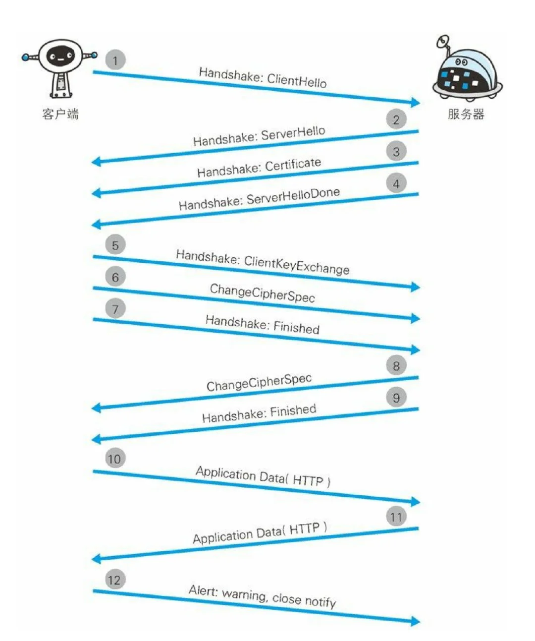 - 最后由客户端断开连接。断开连接时,发送 close_notify 报文。上图做了一些省略,这步之后再发送 TCP FIN 报文来关闭与 TCP的通信。