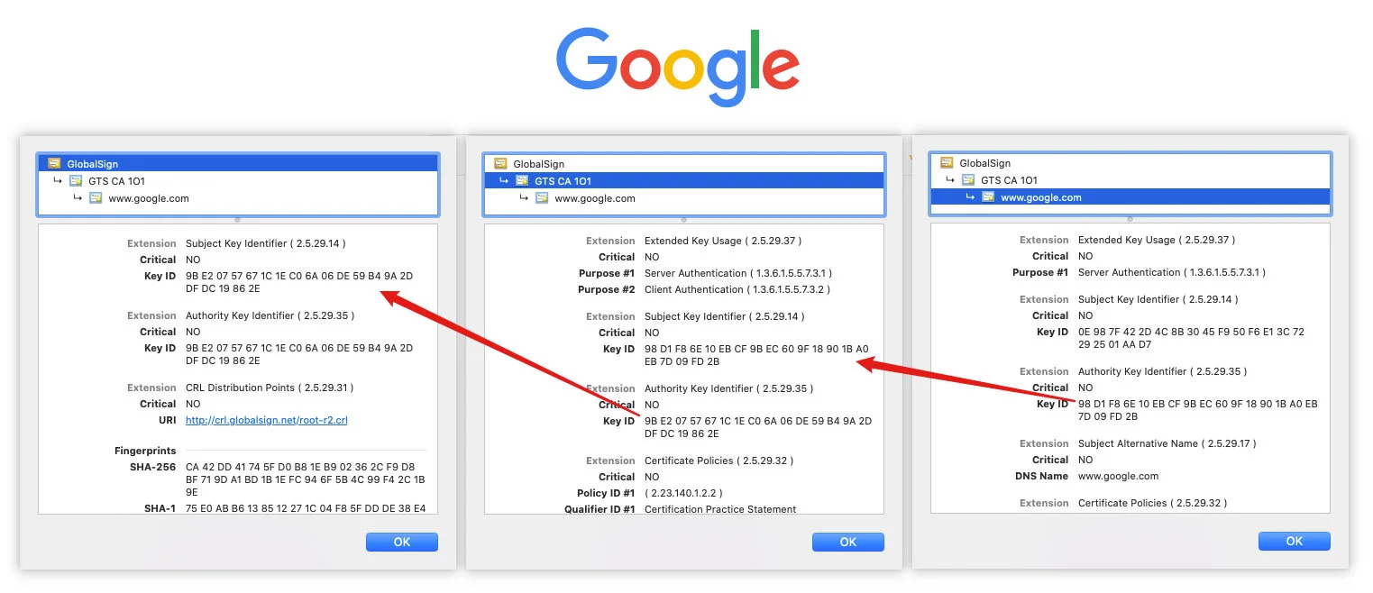 - 之后服务器发送 Certificate 报文。报文中包含公开密钥证书,客户端进行证书的信任链验证,认证过程如下图,授权密钥标识符与其上级主题标识符相匹配,根证书的主题标识符与授权密钥标识符相同