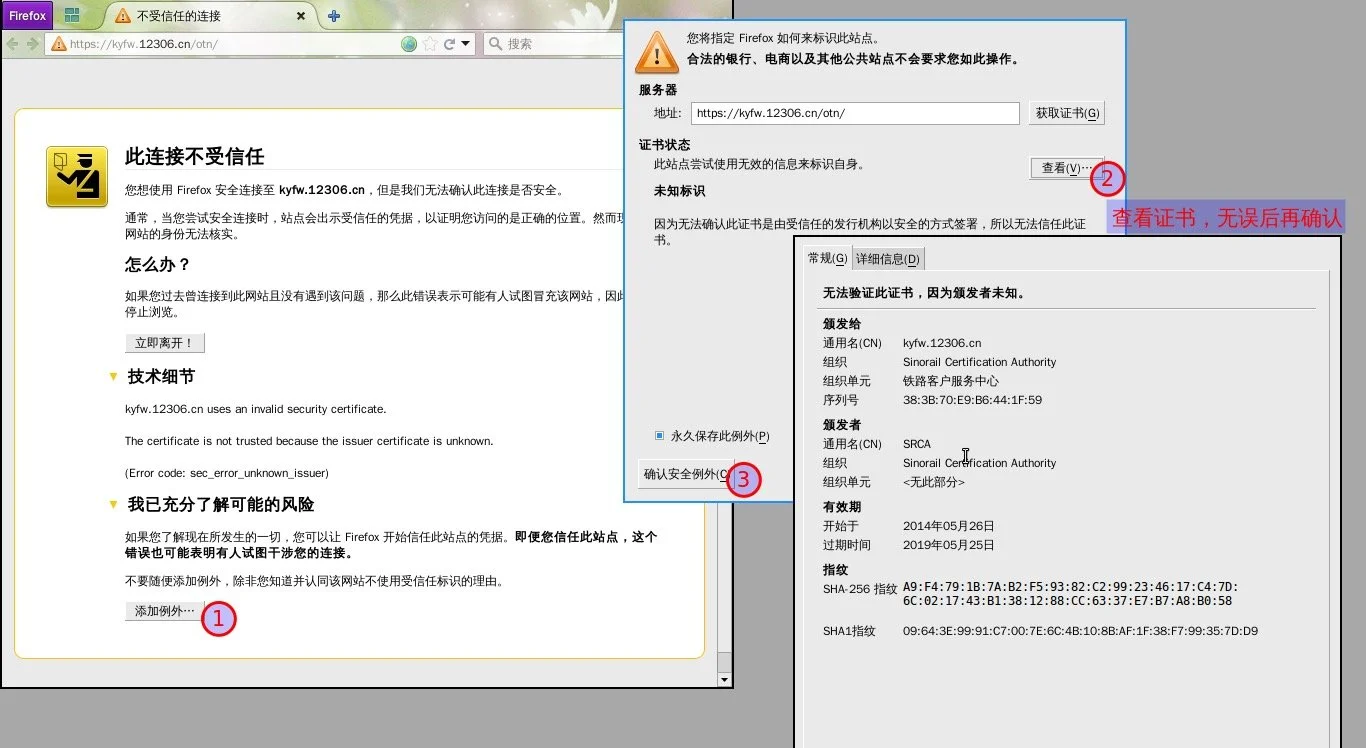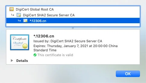 造成这个原因就是 12306 的证书是自签的,而非 CA 机构签发的,这就导致信任链条无法完成,从而发出警告。而当时 12306 对该问题的解决方案是让用户自行安装根证书