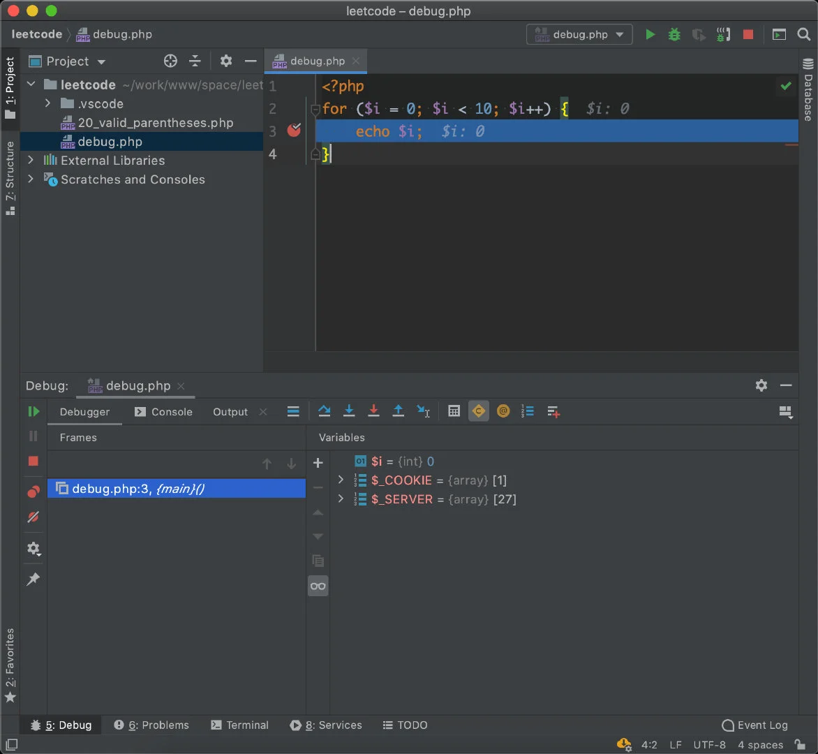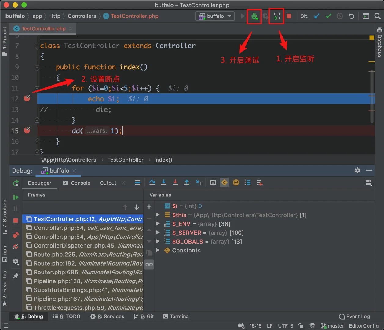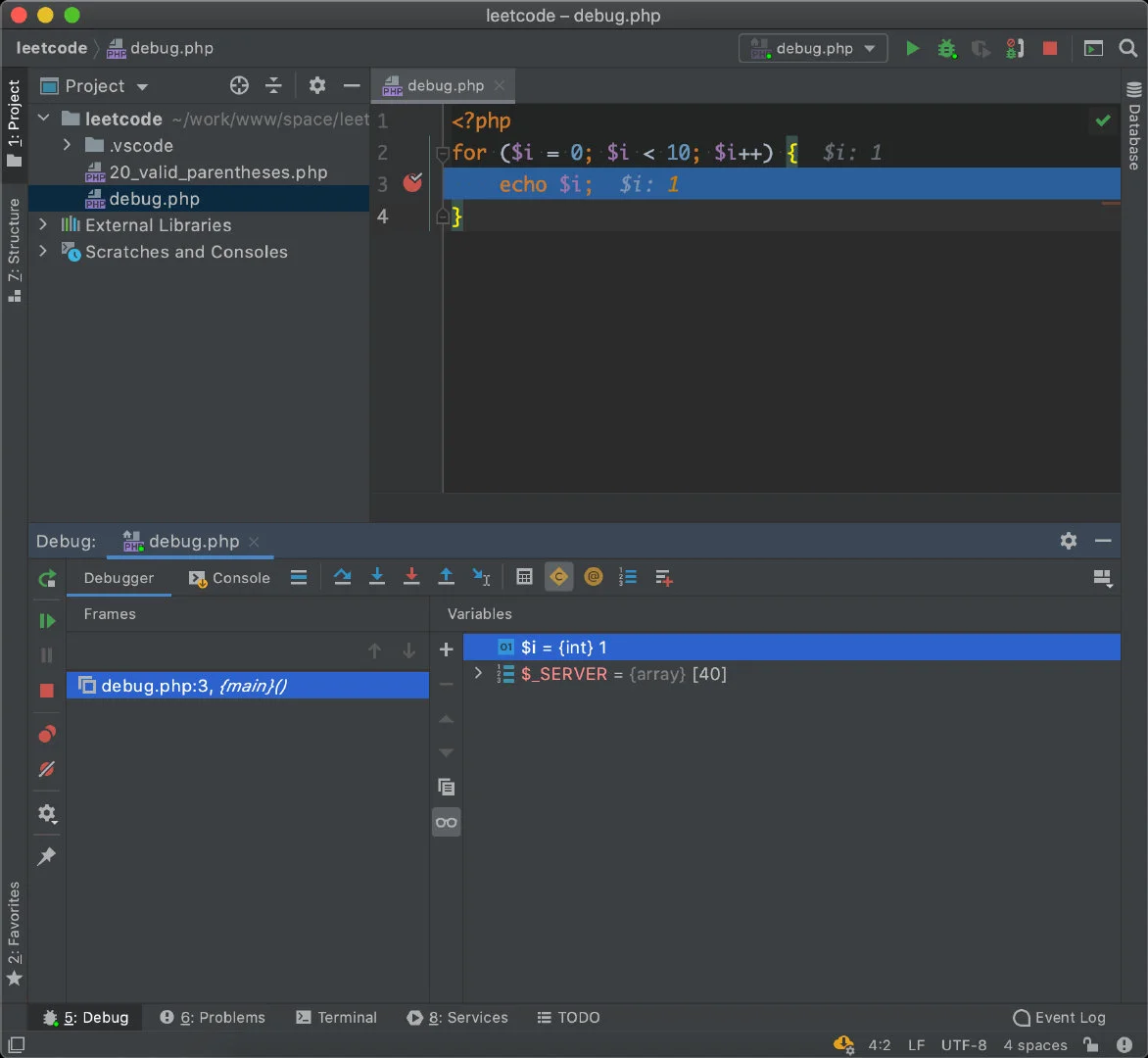 ,然后浏览器访问 http://localhost:8000/debug.php ,即可在 IDE 中获取断点信息
