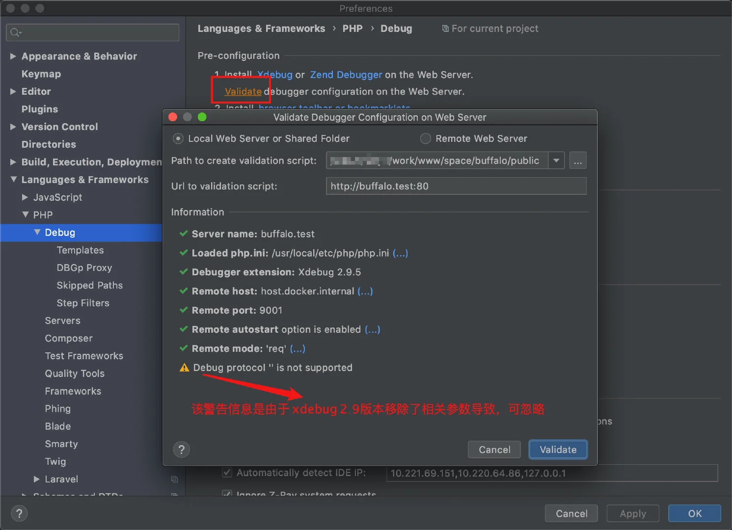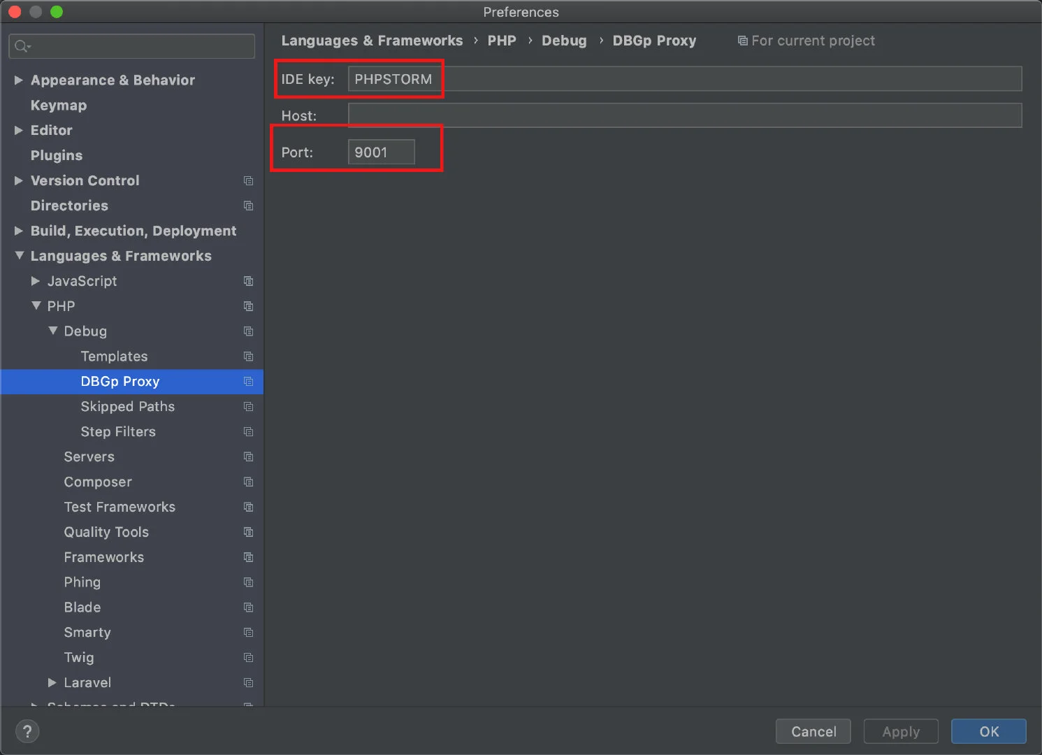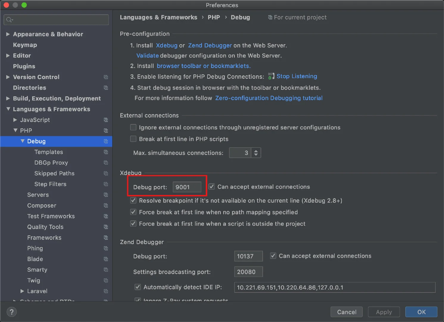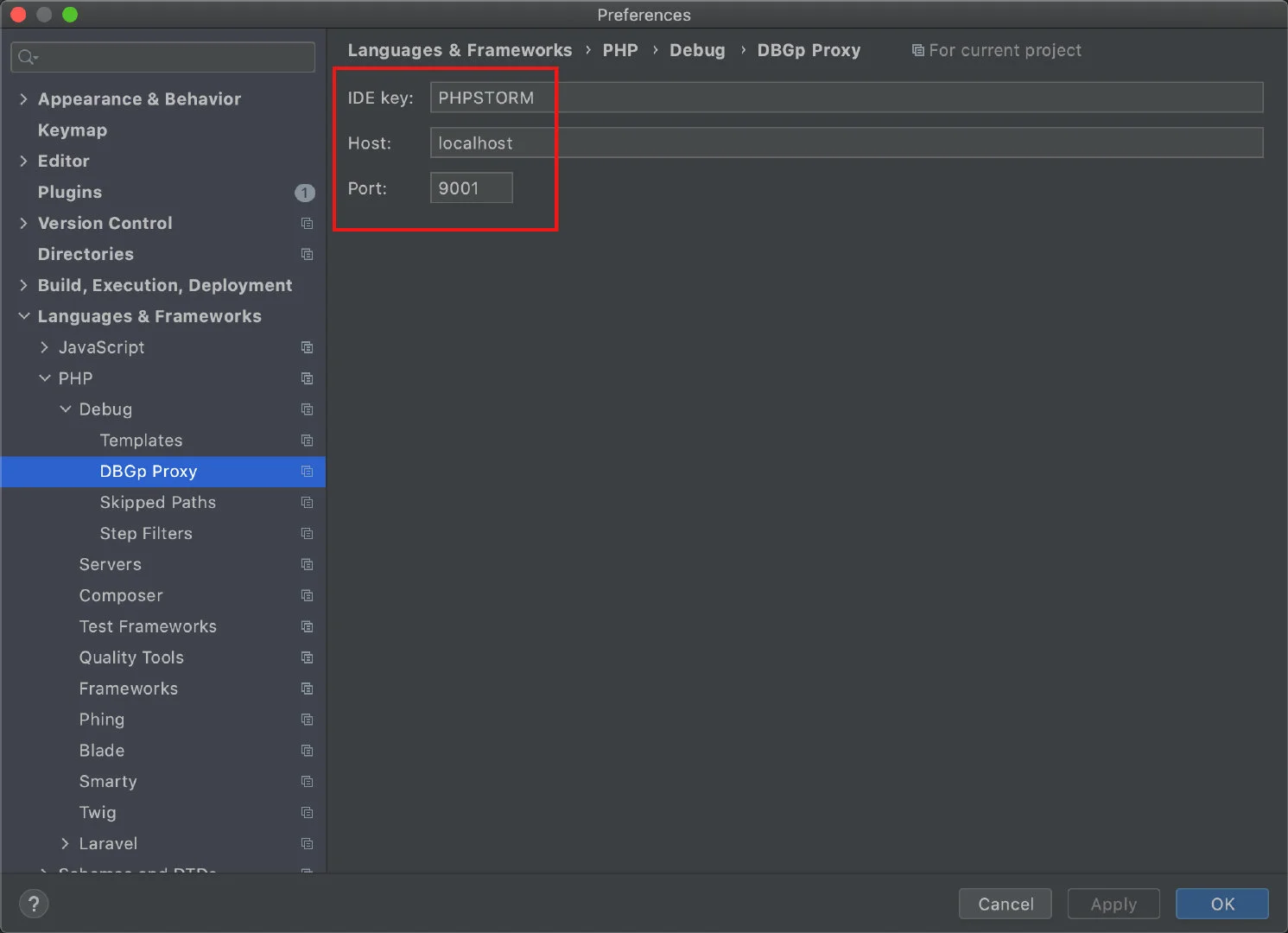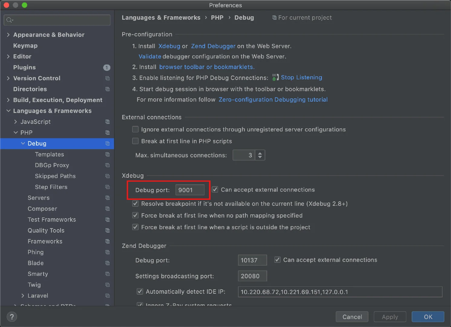 打开 Preferences > Languages & Frameworks > PHP > Debug > DBGp Proxy