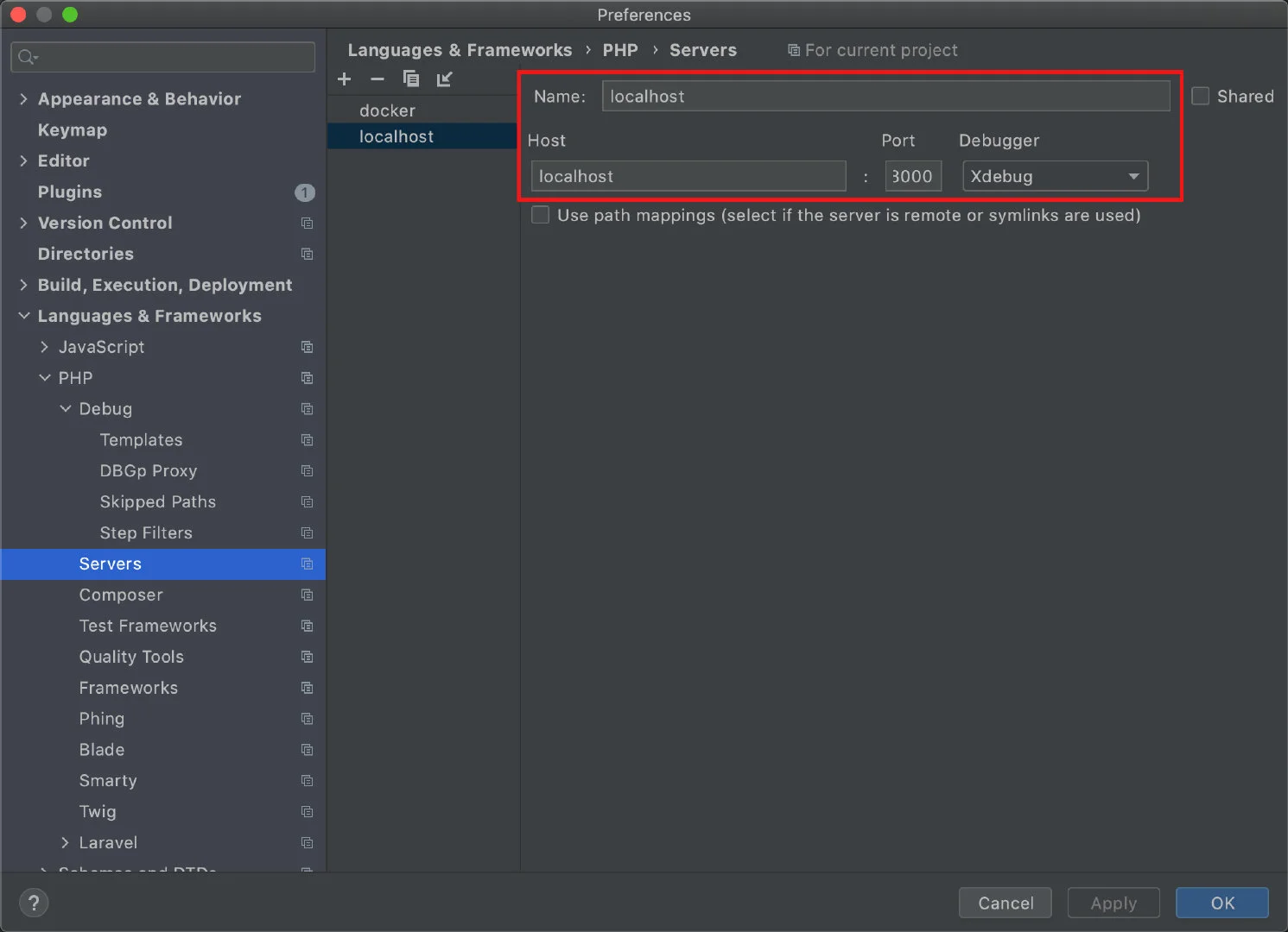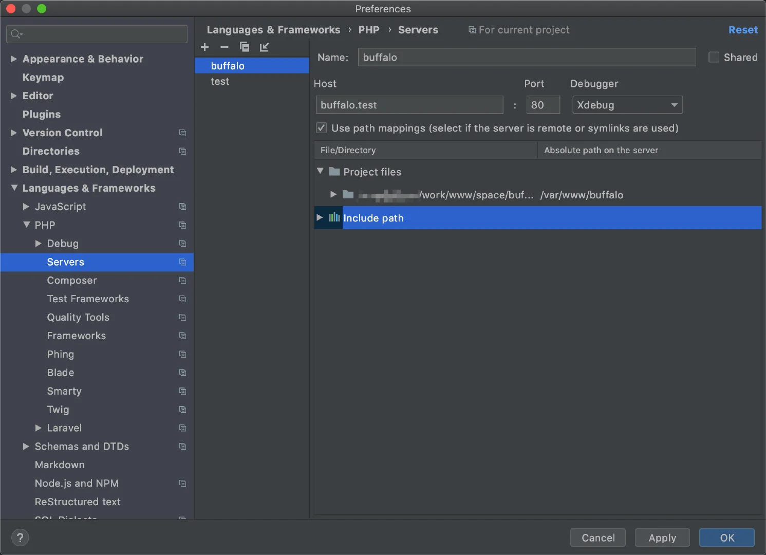 打开 Preferences > Languages & Frameworks > PHP > Server